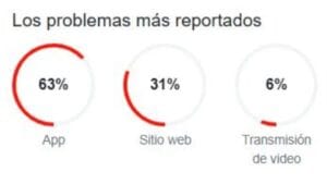 Los principales reportes provienen de la falla en la aplicación con un 63%, seguido de fallas en el portal web con el 31% y la transmisión de video con el 6%.