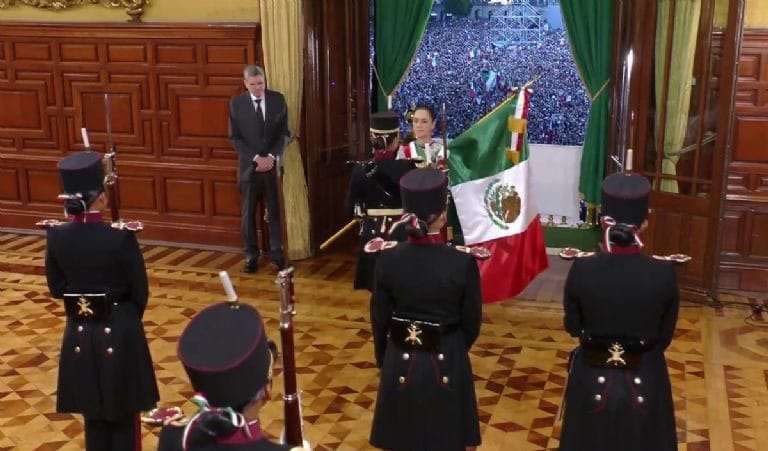 Fue a las horas 22:59 horas que la primera presidenta de México salió al balcón presidencial de Palacio Nacional.