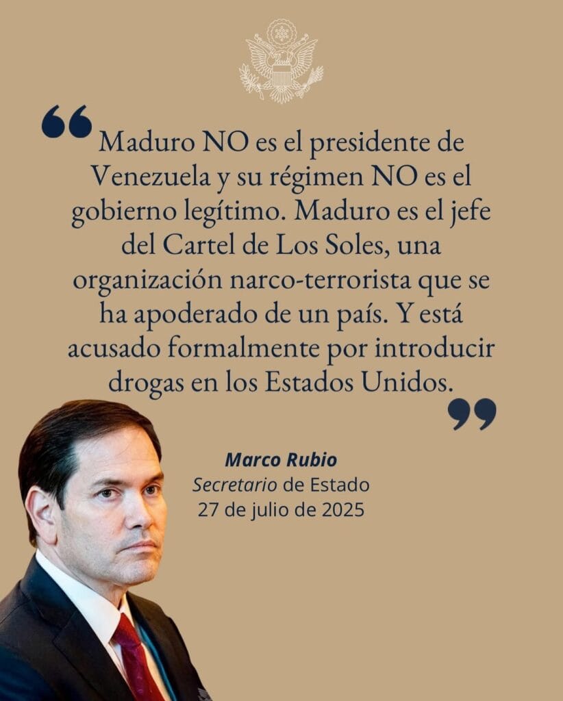 INTERNACIONAL.- El gobierno estadounidense afirmó que a un año de las cuestionadas elecciones en Venezuela, Maduro no es el presidente de Venezuela y su régimen no es el gobierno legítimo». Además, añadió que es el líder de la organización narcoterrorista Cártel de los Soles.
